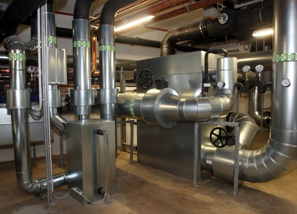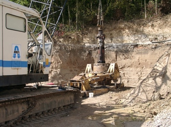 Construction of large-diameter well for the new system (left) and groundwater heat exchanger in the hotel basement (right):