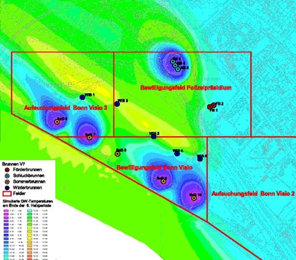 Picture above: View of the development area from the river; the first system from 2004 serves the buildings to the right with the preserved old water tower, the new system from 2009 the hotel in the centre left and the buildings farther left, the building centre right is not connected to the geothermal system